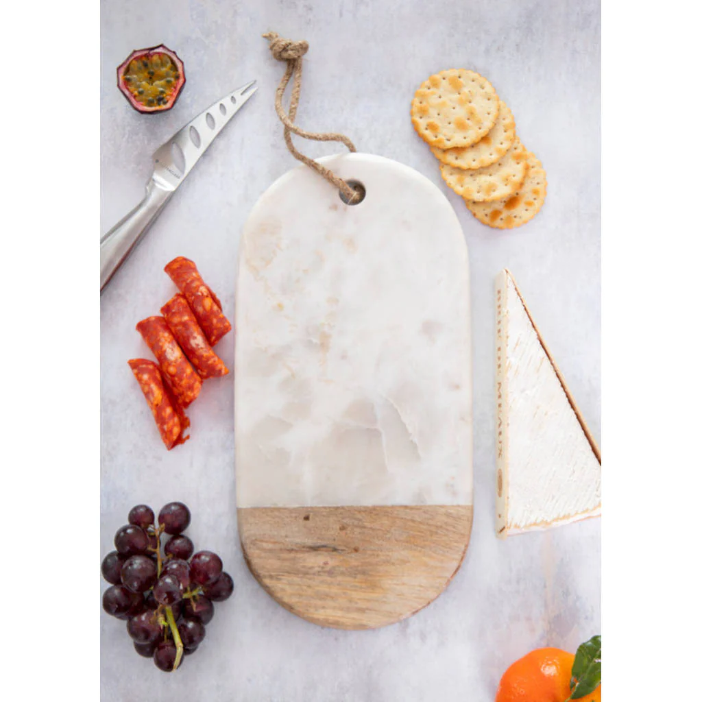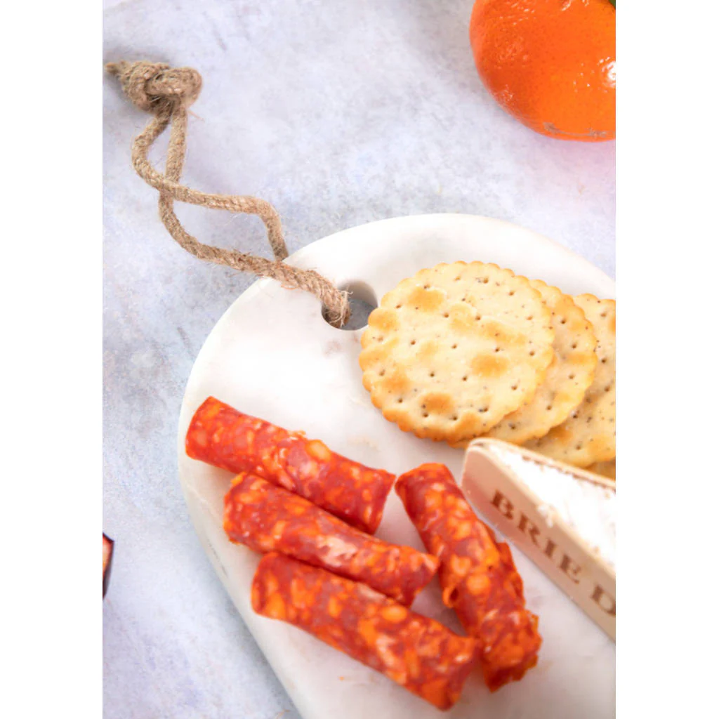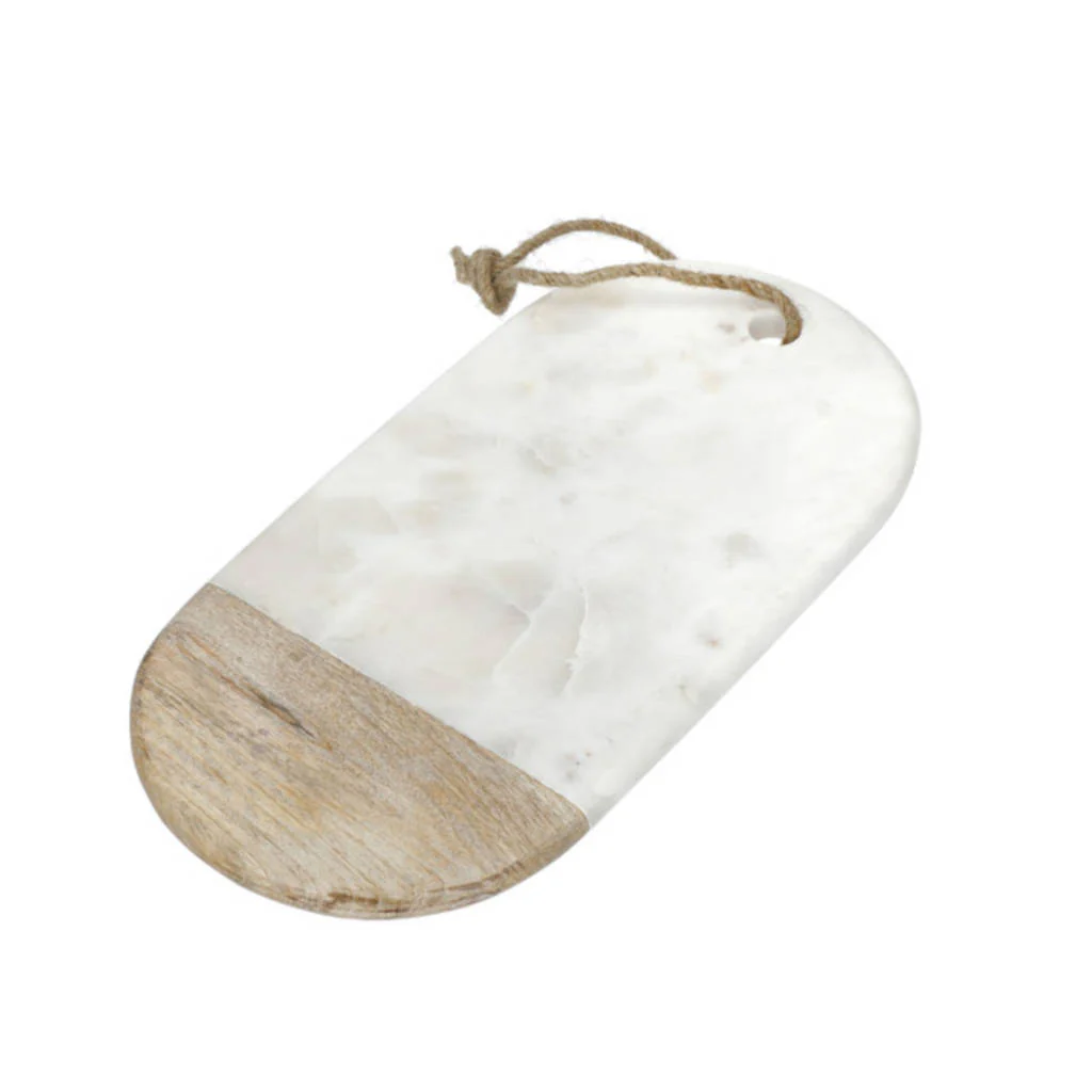Además de su utilidad en la cocina, esta tabla es una hermosa pieza decorativa. Incluye una cuerda para colgar, lo que facilita su almacenamiento y mantiene a la vista la belleza natural del mármol blanco y la veta de la madera de mango, convirtiéndola en un destacado elemento rústico en tu mesa.