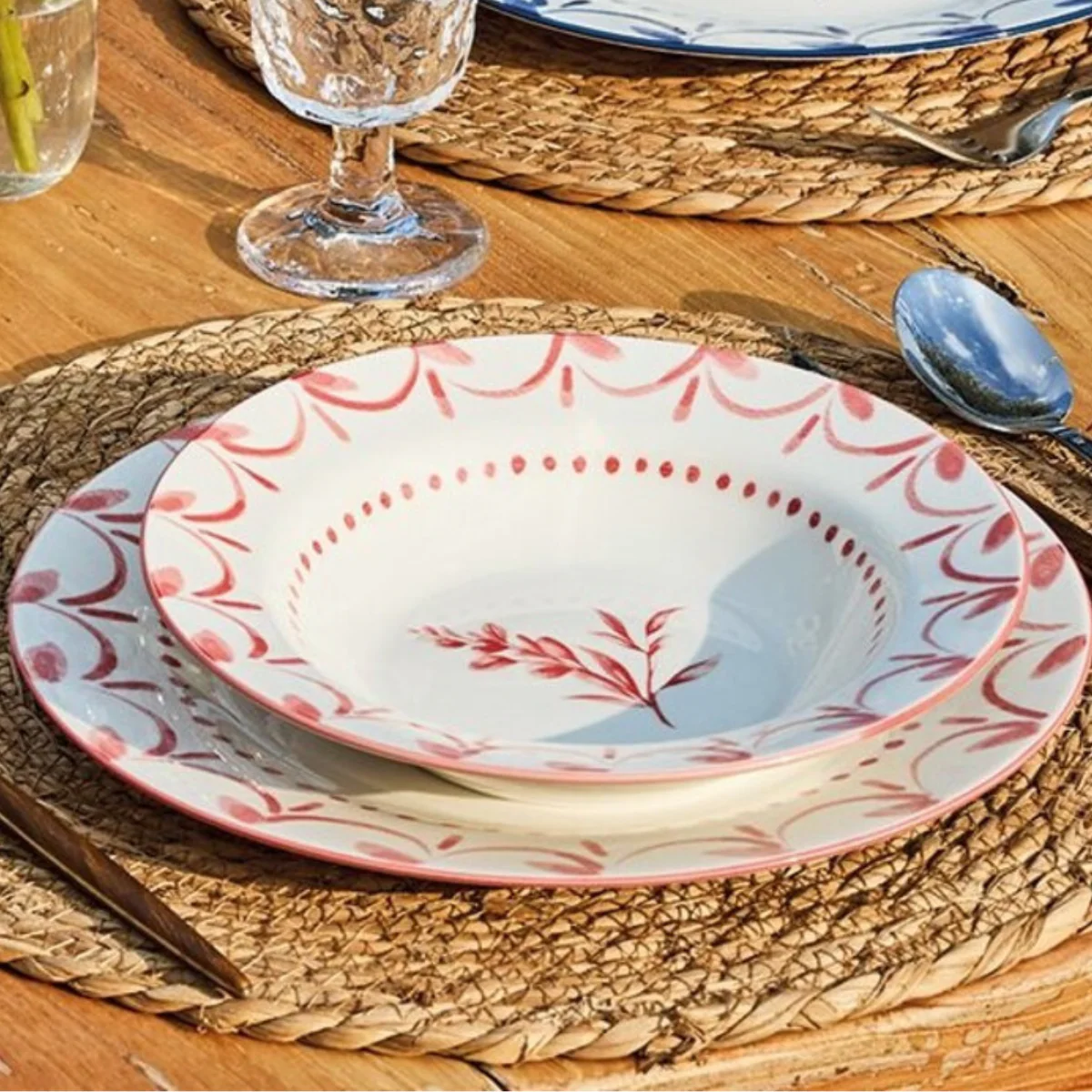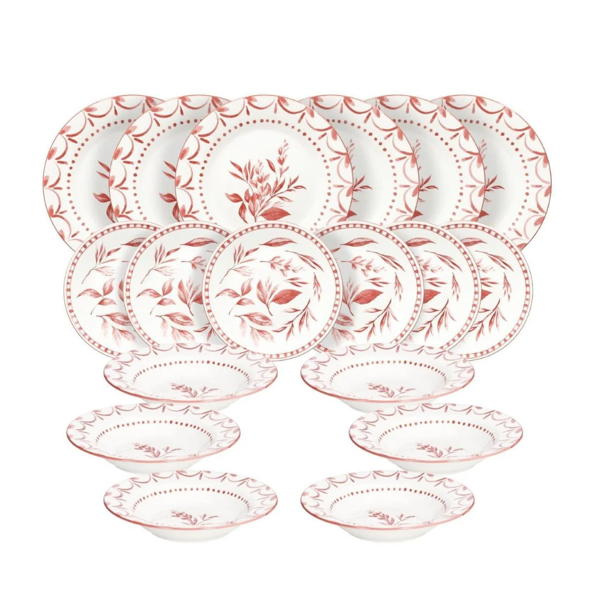 - Cada tipo de plato cuenta con un estampado distinto con motivos florales en color rojo coral.